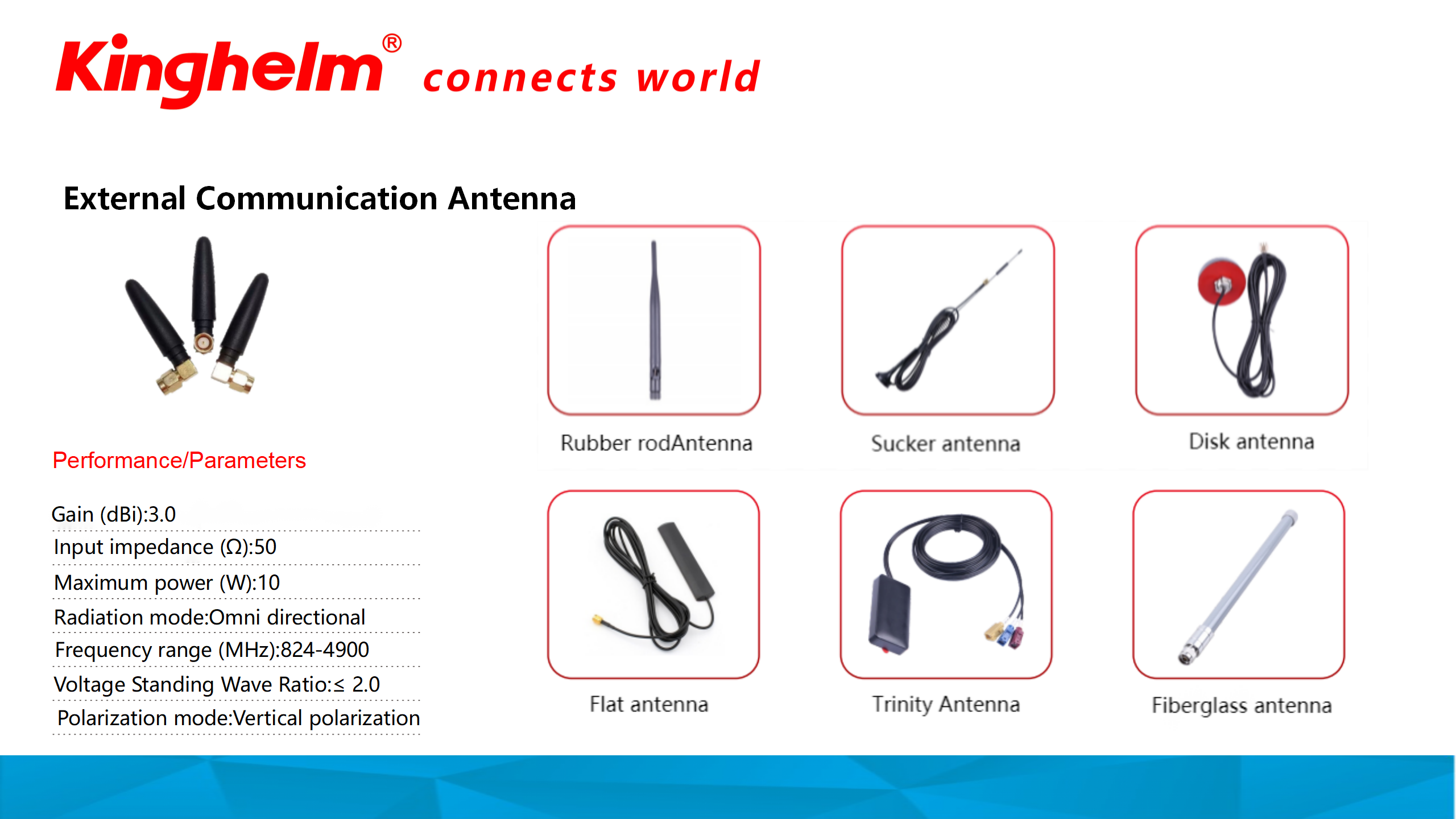 Kinghelm offers a diverse range of antennas tailored for various applications, ensuring reliable and high-speed data transmission. From automotive positioning and Bluetooth connectivity to GNSS, WLAN, and LORA systems, our antennas deliver stable signals for real-time tracking, seamless audio streaming, and efficient IoT communication. With optimized designs for precise location data and fast data exchange, Kinghelm antennas are ideal for enhancing communication performance across industries.