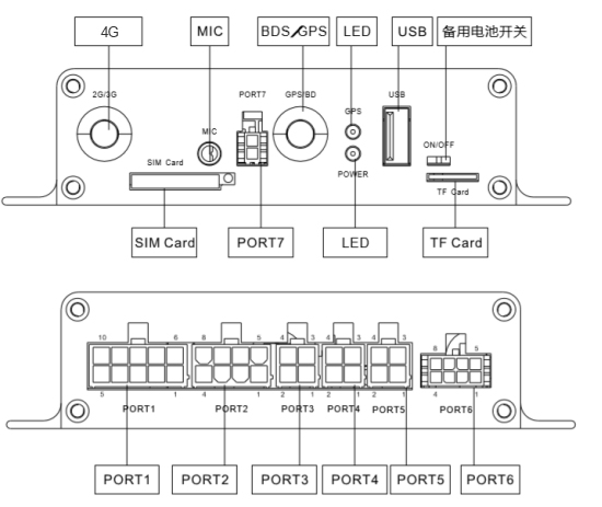 4.Product Detail 4.1 Product Appearance Image The following image shows a schematic diagram of the front side of the vehicle positioning terminal. 4.2 Wiring Harness Definition 4.3 Function Introduction 4.3.1 Positioning Mon