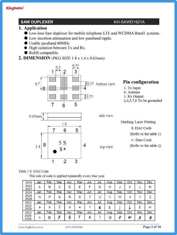Kinghelm SAW Duplexer KH-SAWD1921A: Applicable to LTE and WCDMA Band 1