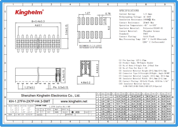 Kinghelm KH-1.27FH-2X7P-H4.3-SMT Specification