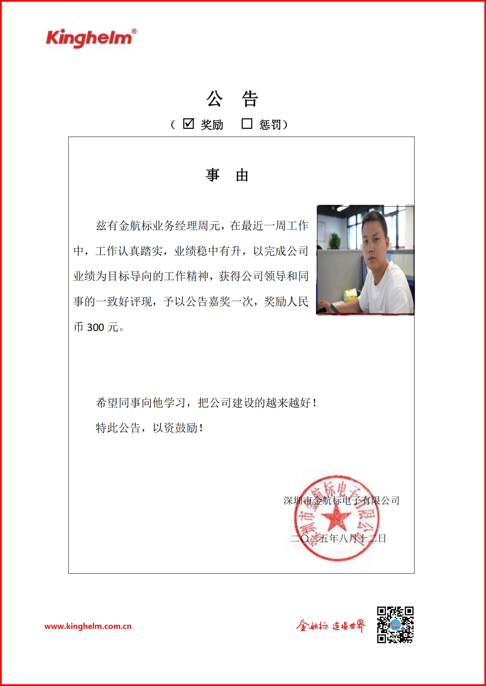 From July 21 to July 25, 2025, Zhou Yuan, sales manager of Kinghelm (www.kinghelm.net) /Slkor (www.slkoric.com), was voted "Weekly Star" by his colleagues. Zhou earned this recognition for his diligence, steady performance growth, and results-driven mindset, Zhou has earned unanimous praise from company leadership and peers. He is hereby awarded a one-time bonus of RMB 300 and public commendation.
