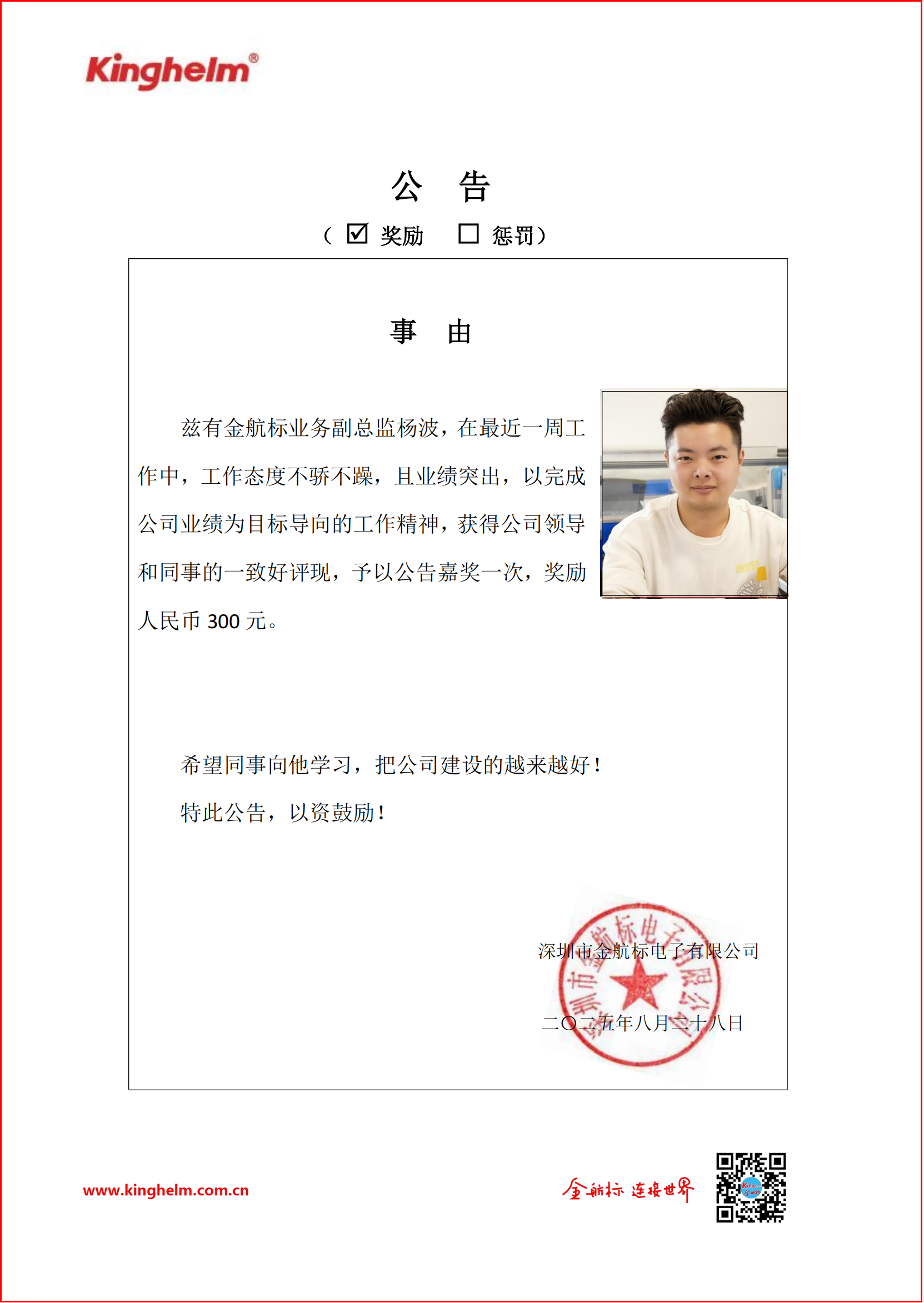 From August 25 to August 30, 2025, Kinghelm and Slkor held the “Weekly Star” selection. This week’s award goes to Yang Bo, Deputy Director of Sales at Kinghelm.