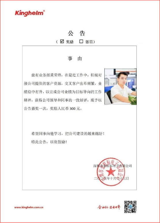 The company hereby announces and commends him for his outstanding performance with a reward of RMB 300.