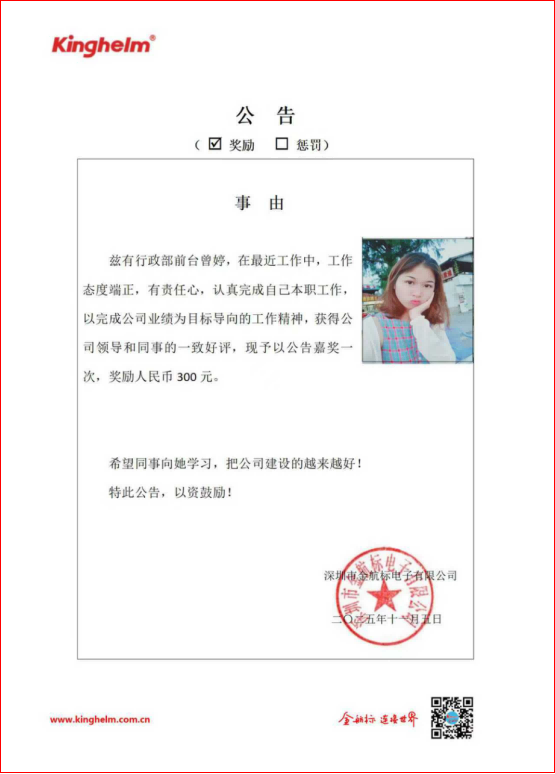 From November 3 to November 8, 2025, after internal voting by colleagues, the “Weekly Star” award at Kinghelm (www.kinghelm.net) and Slkor (www.slkoric.com) goes to front desk receptionist Zeng Ting. In her recent work, she has demonstrated a positive and responsible attitude, completing her duties diligently and always staying aligned with the company’s performance goals. Her professionalism and commitment have earned unanimous recognition from company leadership and colleagues. The company hereby announces this commendation and awards her RMB 300.
