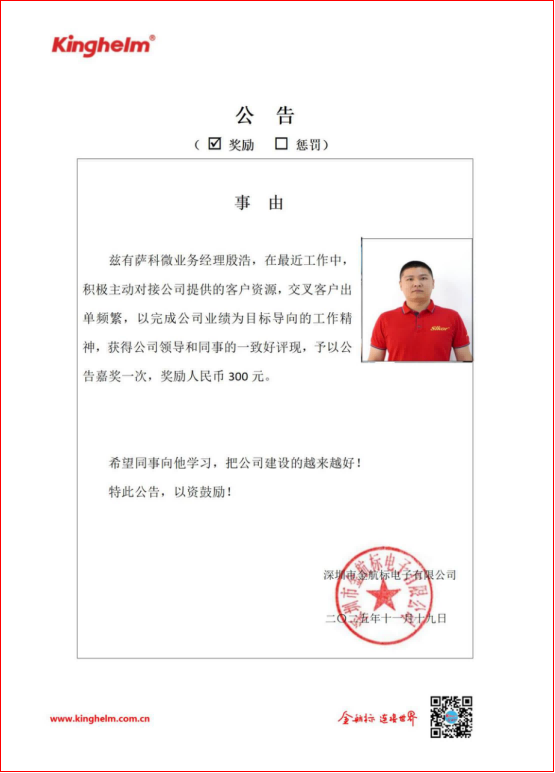 From November 17, 2025, to November 22, 2025, based on colleague evaluations, the "Star of the Week" for Kinghelm (www.kinghelm.net) / Slkor (www.slkoric.com) is Yin Hao, a Business Manager at Slkor. In recent work, he proactively engaged with customer resources provided by the company, frequently secured orders from customers who cross over with Kinghelm, and demonstrated a results-oriented work spirit focused on achieving company targets. He has received unanimous praise from company leadership and colleagues. He is hereby announced for a one-time commendation and a reward of RMB 300.