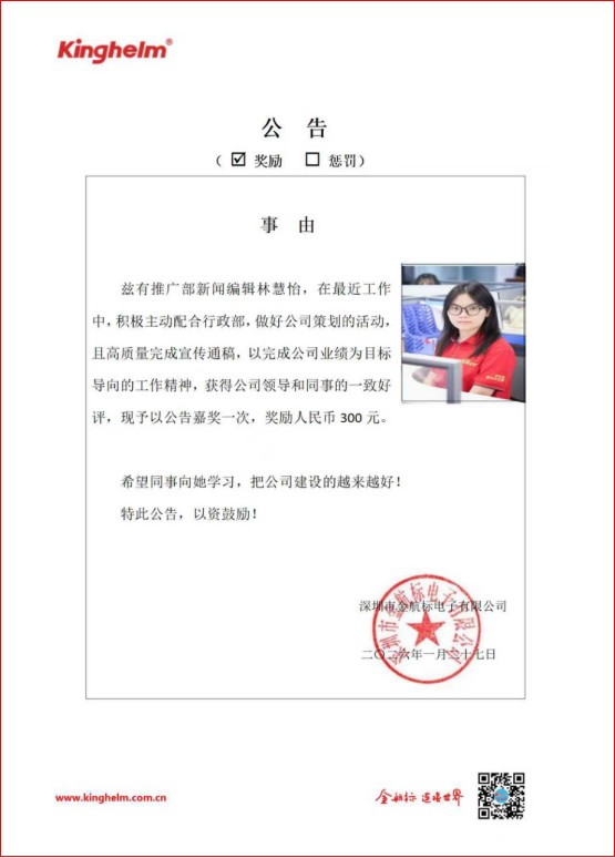 From January 26, 2026, to January 31, 2026, based on peer evaluations for the Kinghelm/Slkor "Weekly Star" program, this week's honoree is Lin Huiyi, a News Editor from the Slkor Promotion Department. In her recent work, she has proactively collaborated with the Administration Department to support company-planned activities and has produced high-quality promotional press releases. Her goal-oriented work ethic, focused on achieving company performance targets, has earned unanimous praise from both leadership and colleagues. She is hereby publicly commended and awarded a bonus of 300 RMB.