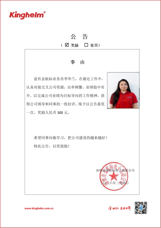 Outstanding Sales Representative of Kinghelm: Li Hualan