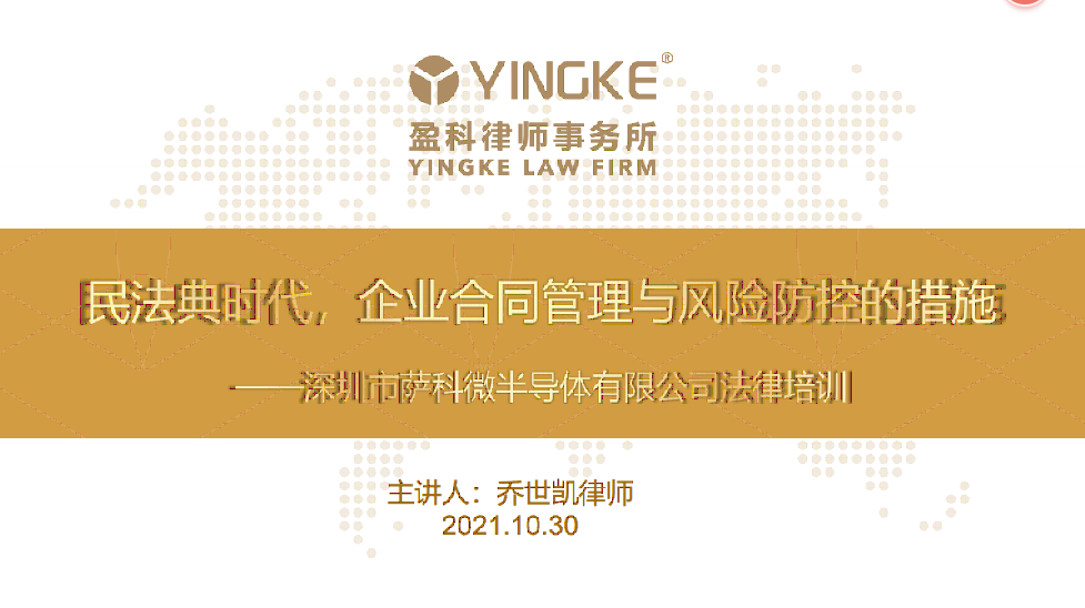 10月30日,在深圳市金航标kinghelm与萨科微半导体位于龙华展滔大厦的会议室,北京市盈科(深圳)律师事务所乔世凯律师为萨科微全体员工进行了法律培训,主题为《民法典时代 企业合同管理与风险防控措施》,总经理宋仕强和萨科微金航标公司的同事全员参与!