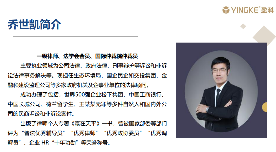 为萨科微公司培训的乔世凯律师,是国家一级律师、法学会会员、国际仲裁院仲裁员,主要执业领域为公司法、政府法律、刑事辩护等诉讼和非诉讼法律事务解决等,出版了个人专著《赢在天平》一书。乔世凯律师是学者型律师,在行业有非常不错的口碑。