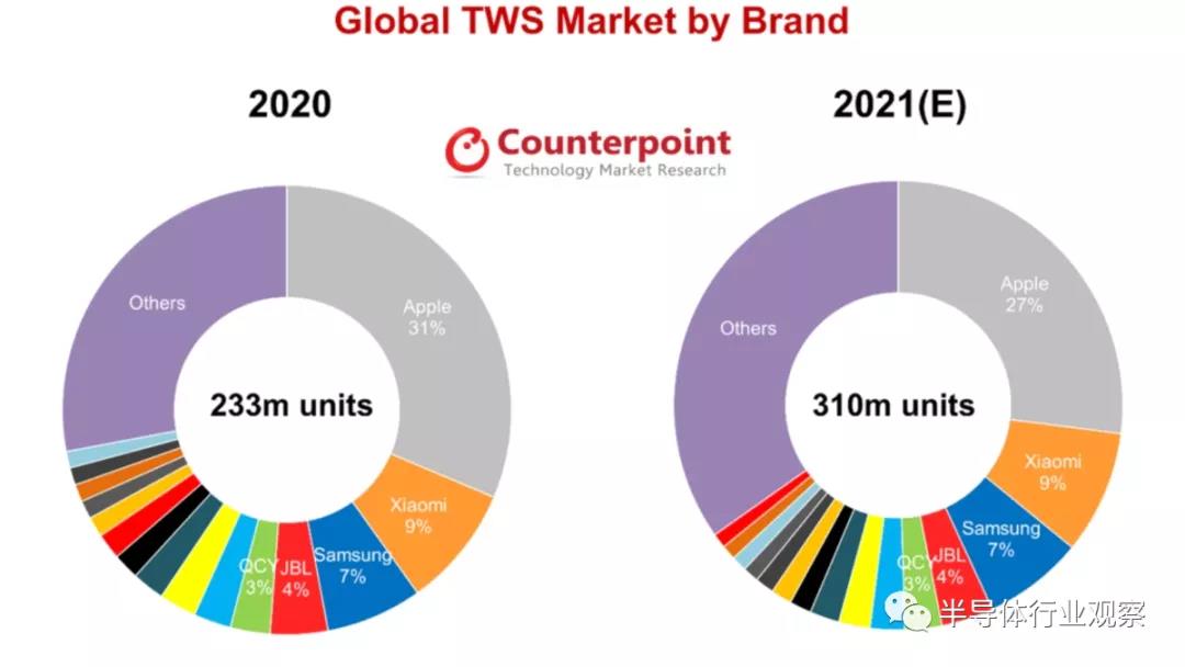 最近几年,TWS耳机的发展势头呈爆发式增长,无论是在市场开拓,还是技术创新和应用上,仍有较大发展空间。根据 Counterpoint 的数据,2021 年全球 TWS耳机市场将同比增长 33%,达到 3.1 亿台。苹果仍将保持领先地位,但该研究公司预测,中低端细分市场将实现高速增长,并将持续到全年。