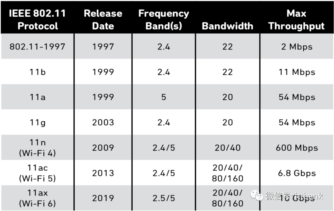 如果您正寻求购置新的无线网络设备或移动设备,太多的选择和缩写会让您不知所措。自 1997 年 Wi-Fi 首次向消费者发布以来,其标准一直在不断发展,通常会带来更快的速度和更高的网络/频谱效率。随着更多功能被添加到原始 802.11 标准中,其相应的补充标准(802.11b,802.11g 等)也广为人知。表1 列出了不同的标准以及基于这些标准可以达到的最大理论数据速率。由于多种因素的影响,包括信号随距离出现的衰减、调制速率和前向纠错编码、带宽、MIMO 乘法器、保护间隔和典型错误率,典型速率会低于理论值。802.11 家族由一系列使用相同基本协议的半双工空中调制技术组成。在本文中,我们将针对每个 Wi-Fi 标准的基础知识展开讨论。