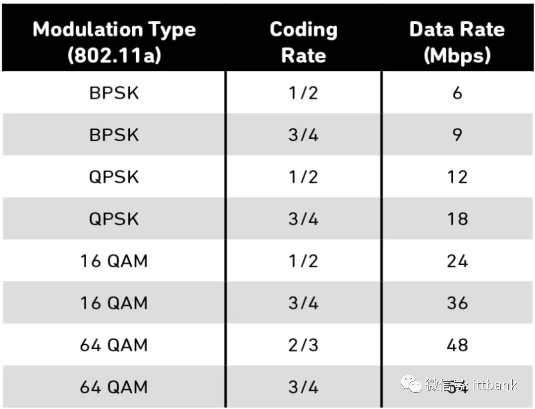 表2 20 MHz 信道间隔的 802.11a 调制速率和数据速率