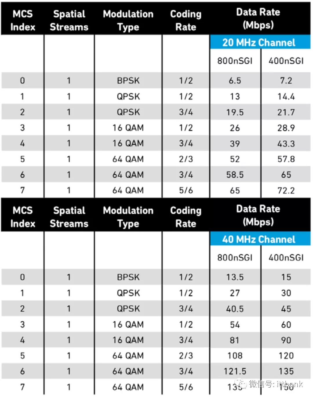 表3 802.11n 单个数据流的调制与数据速率