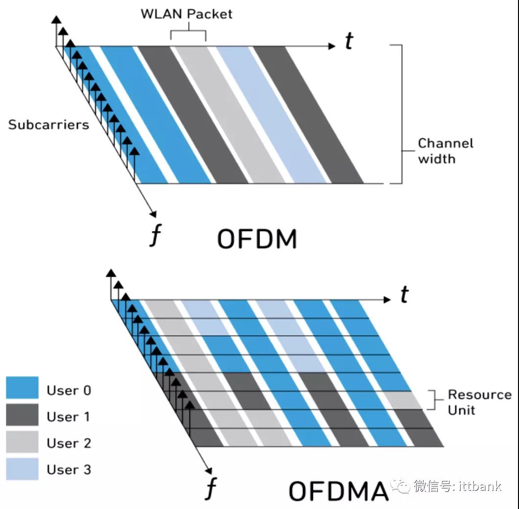 802.11ax 是在 802.11ac 优势的基础上构建的第六代 Wi-Fi,可提供更大的无线容量和可靠性。802.11ax 通过应用更密集的调制(1024 QAM、OFDMA)、降低子载波间隔(78.125 kHz),和基于经调度的资源分配来获得这些优势。与 802.11ac 不同,802.11ax 为 2.4 和 5 GHz 双频技术,并旨在实现最大兼容性,可与 802.11a/g/n/ac 客户端高效共存。802.11ax 采用 OFDMA,允许资源单元(RU)根据客户端的需求划分带宽,并以更快的速度为多位用户带来相同的体验。在 802.11ac 中每个 PLCP 协议数据单元(PPDU)中载波的任何给定点,Wi-Fi 信道被分解为更小的 OFDM 子信道集。然而,由于 OFDMA(802.11ax),其会在每个 PPDU 的基础上将各个子载波组分别作为资源单元分配给客户端(图2)。