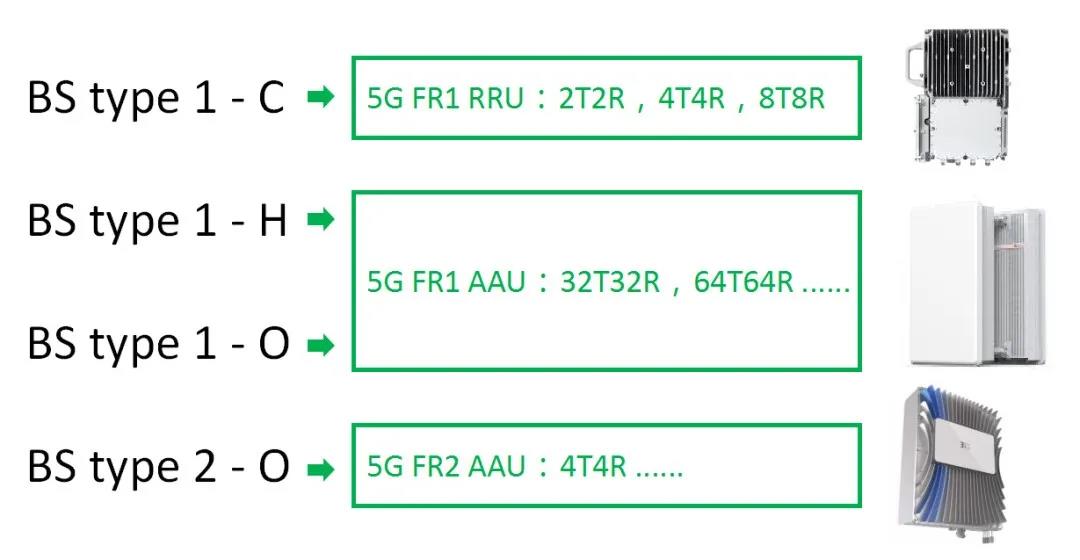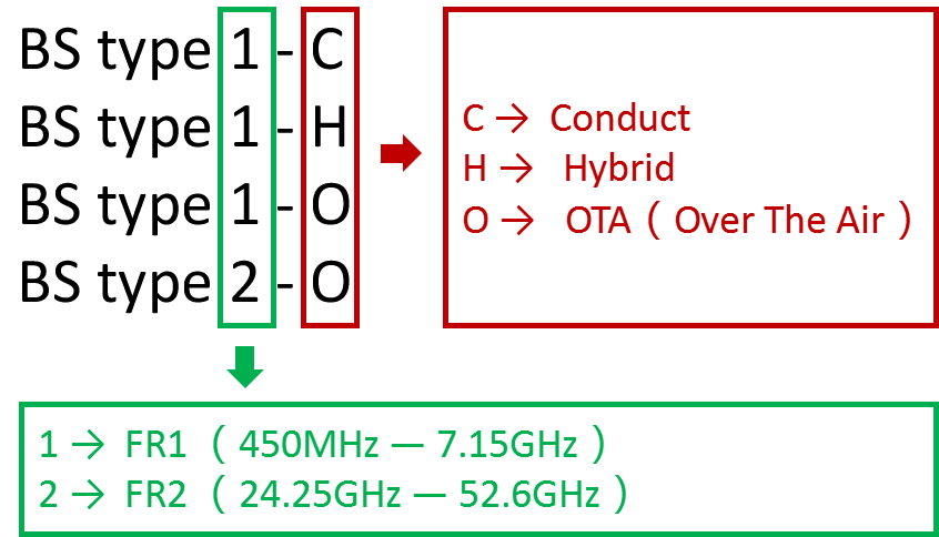 后面的1和2则代表不同的频段。1代表FR1,也就是Sub6G频段,2代表FR2,也就是毫米波频段。剩下的就是最后一位的核心代码,其中C代表Conduct,意为传导,也就是传统RRU测试可以通过线缆连接来进行发射功率的测试。H代表Hybrid,意为混合的,也就是中频(2600M或3500M)的AAU既可以把天线拆下来,像普通RRU一样测试功率,也要把天线装上,测试其他指标。O则代表Over the air或者OTA,就是毫米波AAU的方式了,射频和天线密不可分,只能通过空中传播来测试所有指标(最重要的就是EIRP)。