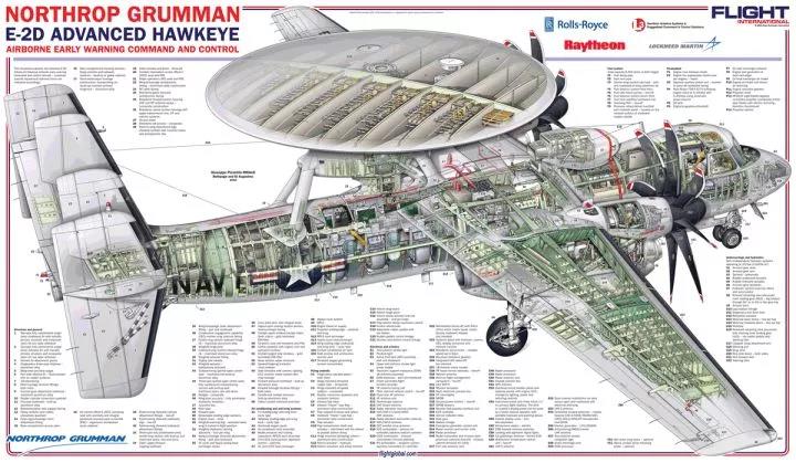 当然也有些比较特殊的。比如下面这个采用八木天线为单元的E2D预警机使用的APY9雷达。因为相对于其使用的uhf波段电磁波波长长,其天线尺寸非常有限,为了获得更加理想的窄波束和高增益,它的天线单元波束就得窄下来,因此八木天线成为了一个较理想的选择。高增益的八木天线作为单元,能够使阵列的增益有明显提升。但是事物总是相对的,八木天线较窄的单元波束,大大限制了阵列的宽角扫描能力。当天线扫描角偏离法线较大时,增益的下降和波形的畸变将非常明显。因此APY9使用了机电扫结合的方式,来弥补不足。