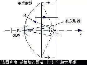 卡塞格伦天线。是一种在单反射面天线形式上改进而来的天线。相比单反射面天线,增加的副反射面可以初步优化喇叭发射出来的电磁波,并使之呈一个更为理想的分布,反射回主反射面,主反射面再将该整形后的球面波变成平面波,并使之辐射到自由空间中去。这样的优点是能提高天线口径效率,提高增益,大大降低了焦径比,降低天线整体的剖面,减小体积。接收机和馈线也变为主面之后,更利于系统的走线布置并降低系统噪声。但副反射面的引入也会带来对主面遮挡增加的问题,这会反过来降低天线整体的增益和抬高副瓣电平。