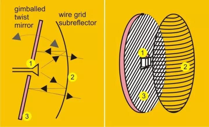 为了解决副反射面遮挡的问题,一种叫做倒置卡塞格伦的天线被提出来并广泛应用在机载雷达中。倒置卡塞格伦,也被称为变形卡塞格伦天线。它在卡塞格伦天线的基础上,将副反射面位置变为极化栅格抛物面,主面位置变为极化扭转板。(实际上,在倒卡天线中,主、副面位置已经与普通卡塞格伦有明显不同。)工作原理与卡塞格伦天线有较大区别:位于极化扭转版处的喇叭馈源,发出的水平线极化电磁波被前方的极化栅格几乎全反射回来,并将该球面波变为平面波,打在后面的极化扭转板上,将水平极化波“扭转”为垂直线极化电磁波,从前方的极化栅格中透射出去,辐射到自由空间中。简而言之,倒卡馈源发出的波束虽然也经过两次反射,但是不同于普通卡塞格伦天线,它中间有个极化扭转的过程。位于天线前方的极化栅格只对水平极化电磁波有遮挡,对垂直线极化波几乎无影响。这里顺便提一下,为了对抗地杂波,机载雷达天线多为垂直线极化天线。它通过适当旋转极化扭转板来实现波束扫描。因此,倒卡天线解决了副反射面遮挡的问题,而且还能把馈源和极化栅格稍微偏置,进一步降低了整体天线的剖面。因其特有的优势,倒卡天线在二代机中很受欢迎。