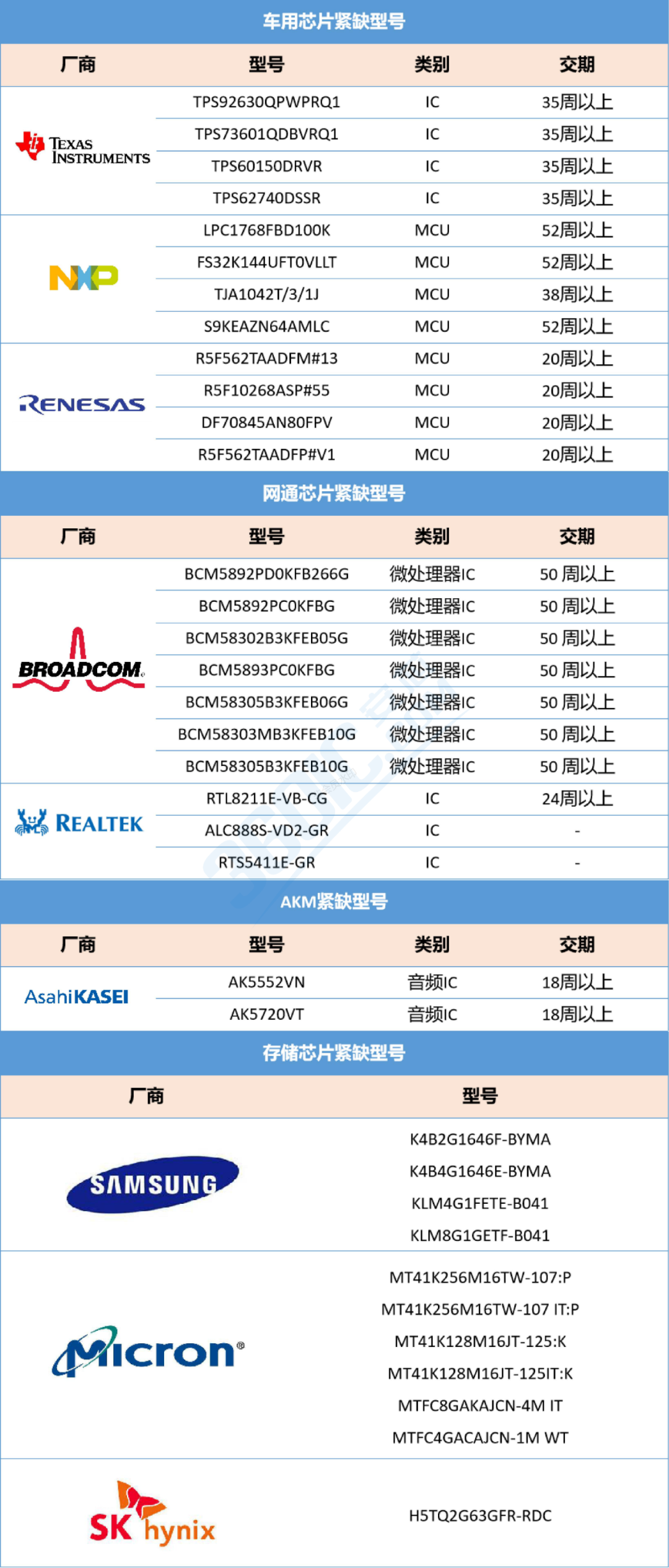 汽车、网通、存储行业芯片最紧缺