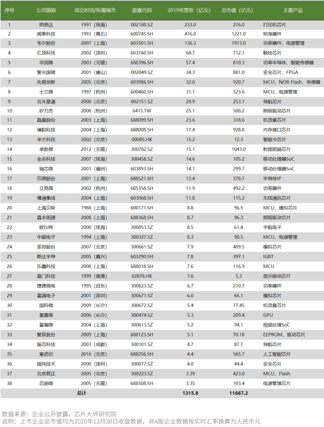 Table: List of China's Major Chip Design Listed Companies in 2020 (38)