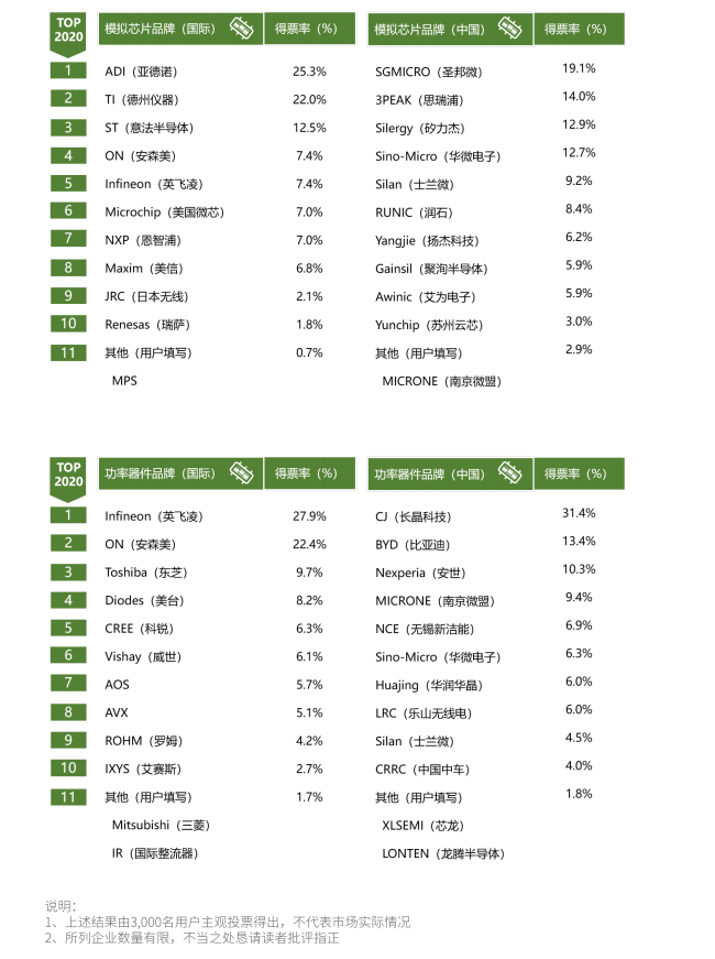 In addition, in the three major segments of main control chips, analog devices and power devices, users have once again selected well-known brands that can play the role of "China Chip" in their minds.