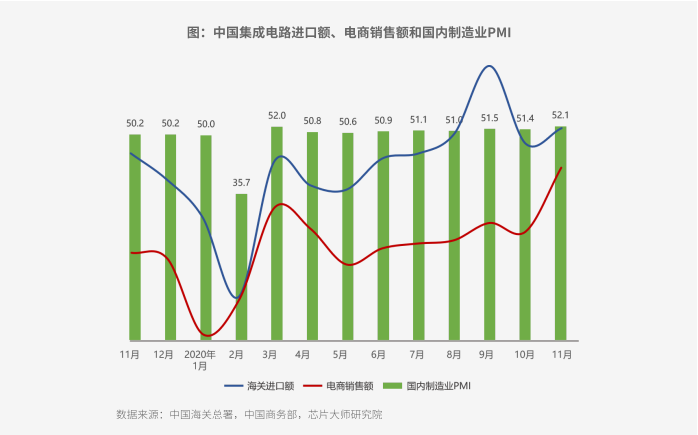 The Chip masters Research Institute retrieved China's manufacturing purchasing managers' index (PMI) data over the same period, of which the index in March and November exceeded 52%, hitting a peak since September 2017. The superposition reflects that since February, with the normalization of work resumption and epidemic prevention and control, domestic integrated circuit trade and downstream manufacturing demand have continued to be strong.