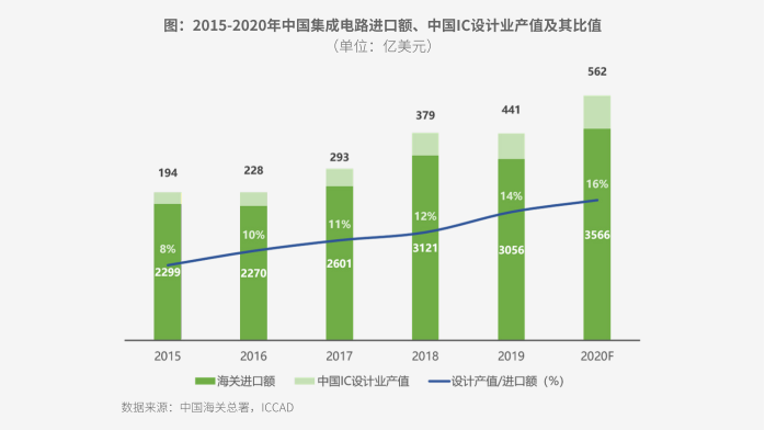 Statistics from the General Administration of Customs of China show that from 2015 to 2020, my country's integrated circuit treasury increased from US$229.9 billion to US$356.6 billion, with a compound annual growth rate of 7.6%. During the same period, ICCAD data showed that the sales of IC design industry increased from US$19.4 billion to US$56.2 billion, with a compound annual growth rate of 19.4%, and the yuan was higher than the import value. At the same time, the ratio of IC design industry to import value increased from 8% to 16%, which fully shows that Chinese chip manufacturers are growing rapidly and expanding their share.