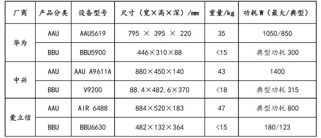 新的5G gNB基站对机房配套和天面配套的要求远高于以往2/3/4G基站,主要原因是新的AAU设备从体积、重量和功耗都增加,表3为目前典型设备的参数表。