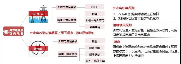 b)外市电:优先利旧原有外电。在外电不足的情况下,通过电池削峰,扩容等手段解决5G外电需求,最大限度降低建设成本,外市电改造是难点,可按照如图3所示步骤完成改造。