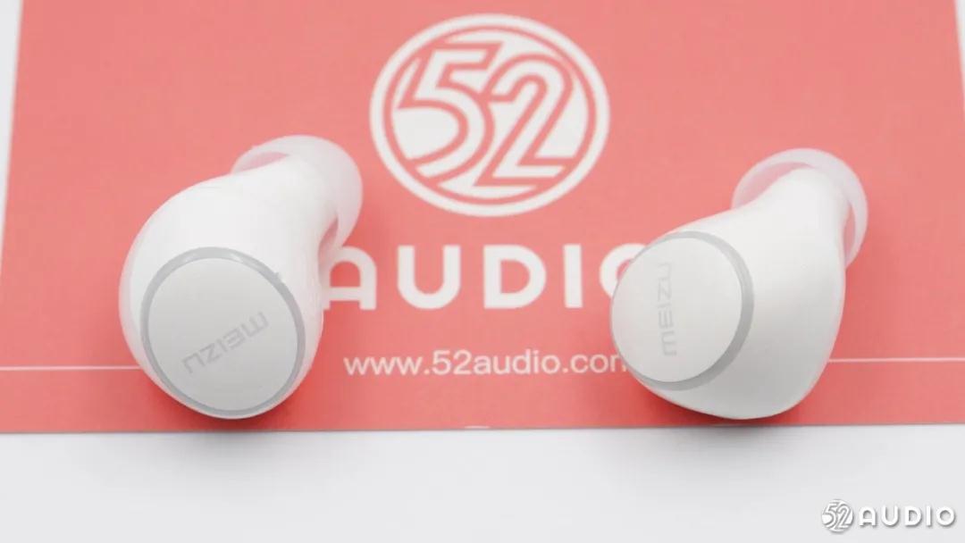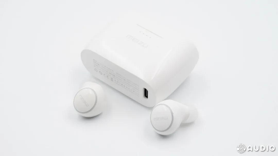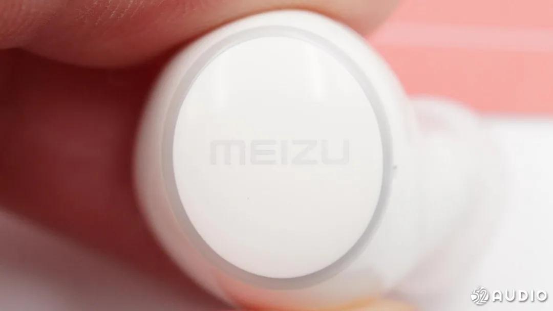 耳机外壳支持触控,上面有魅族的品牌名,外圈依旧是魅族POP系列标志性的光环设计,此次采用了白色光环而非蓝色,官方宣传这样与充电盒的白色指示灯更统一。