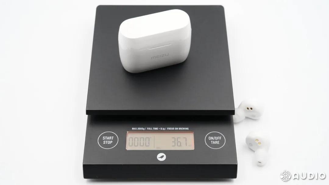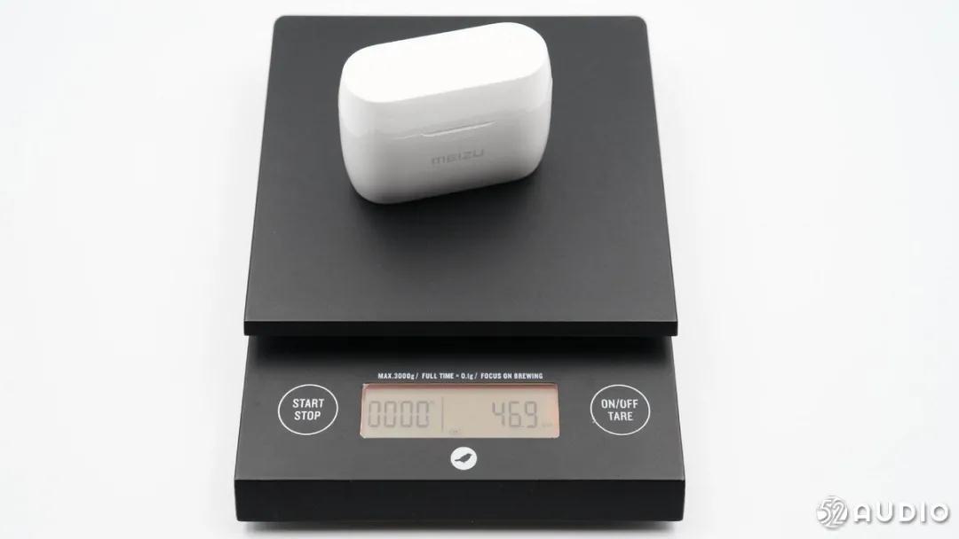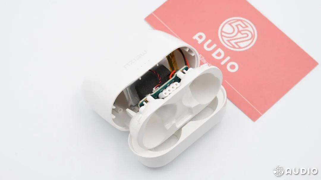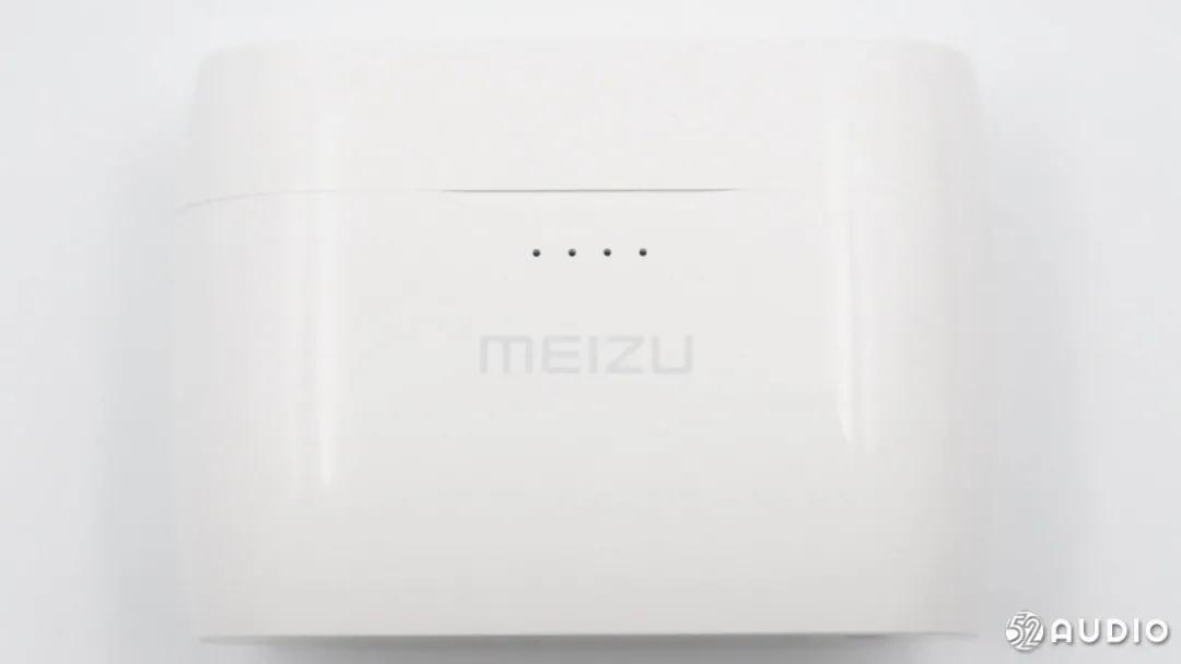 充电盒正面展示,外观与前代一致,顶部和底部均为平面,可放置在桌面上。正面开盖处有凹槽、电量指示灯和魅族的品牌名。