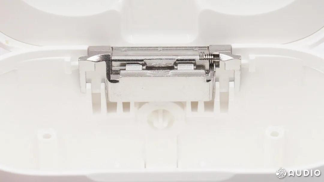 充电盒背面展示,盒盖通过金属合页连接机身,下面有一个快速配对按键。