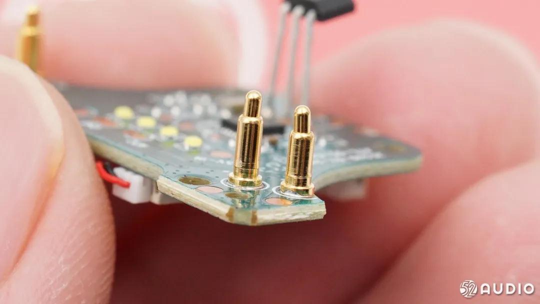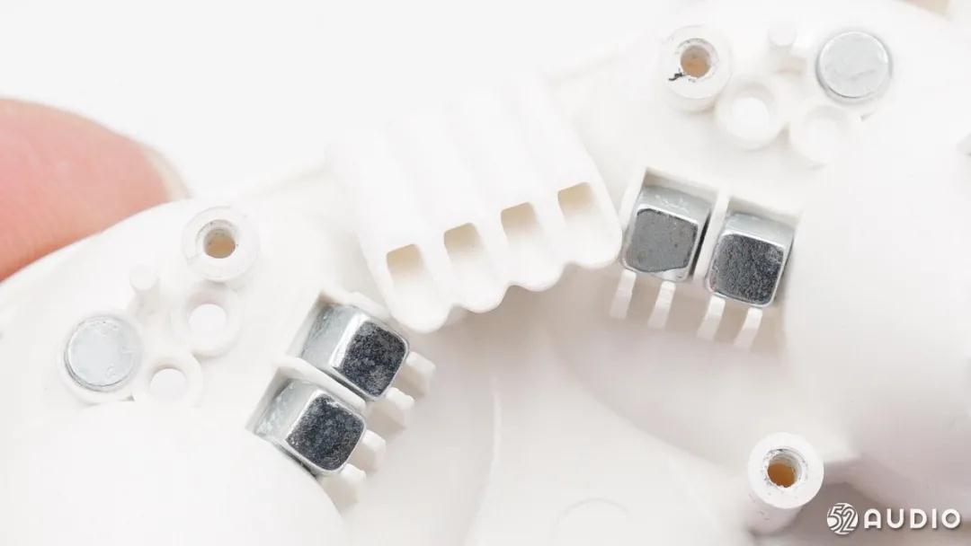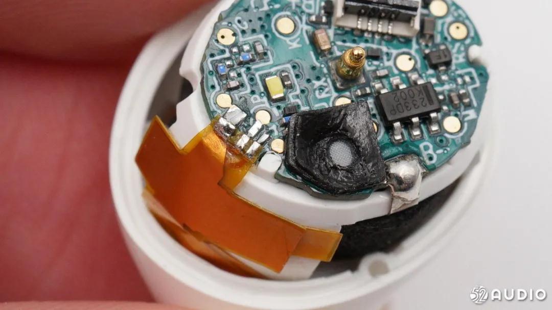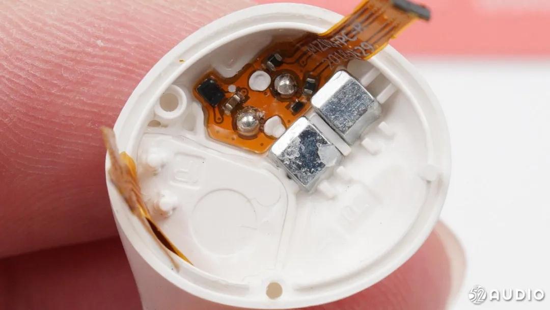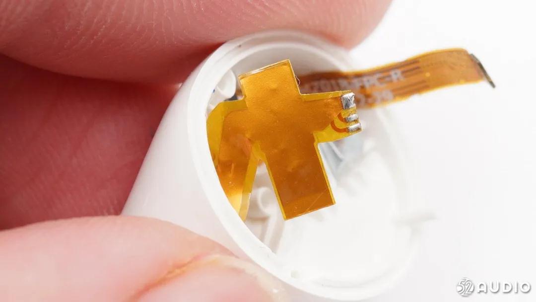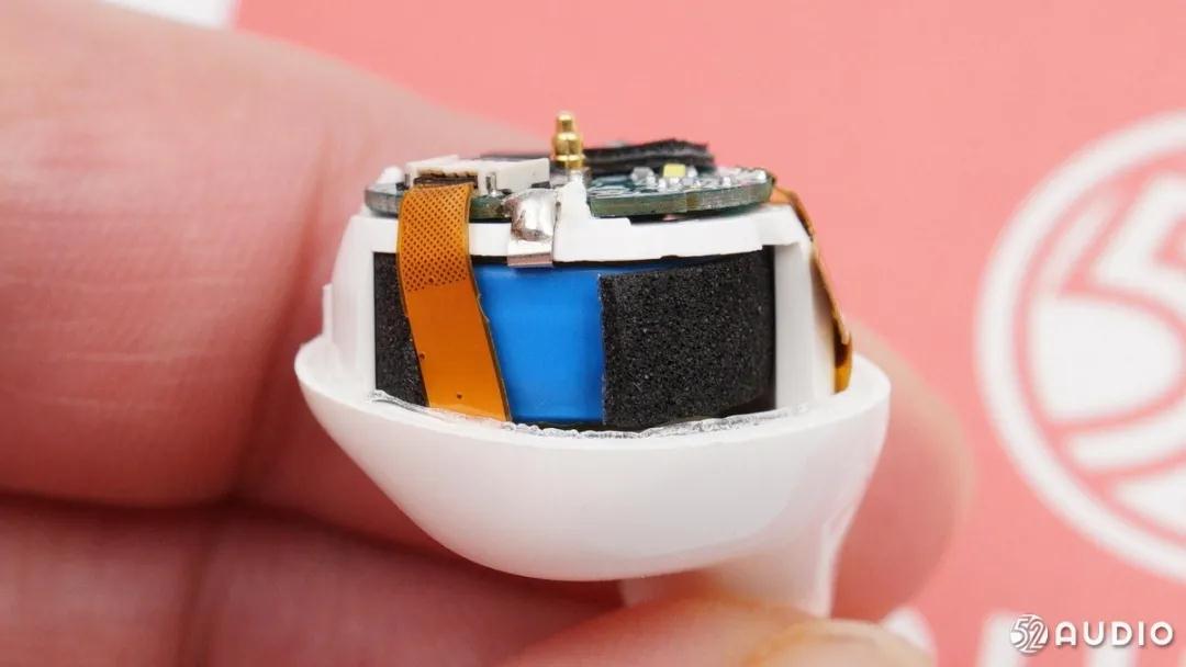 音腔内的布局展示,扬声器单元独立密封,两颗磁铁用于吸附充电座舱。充电触点通过FPC与主板相连。