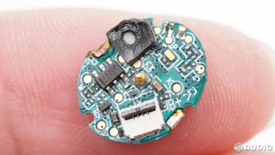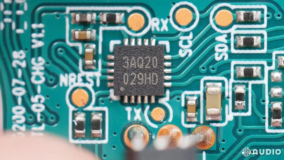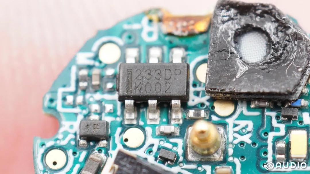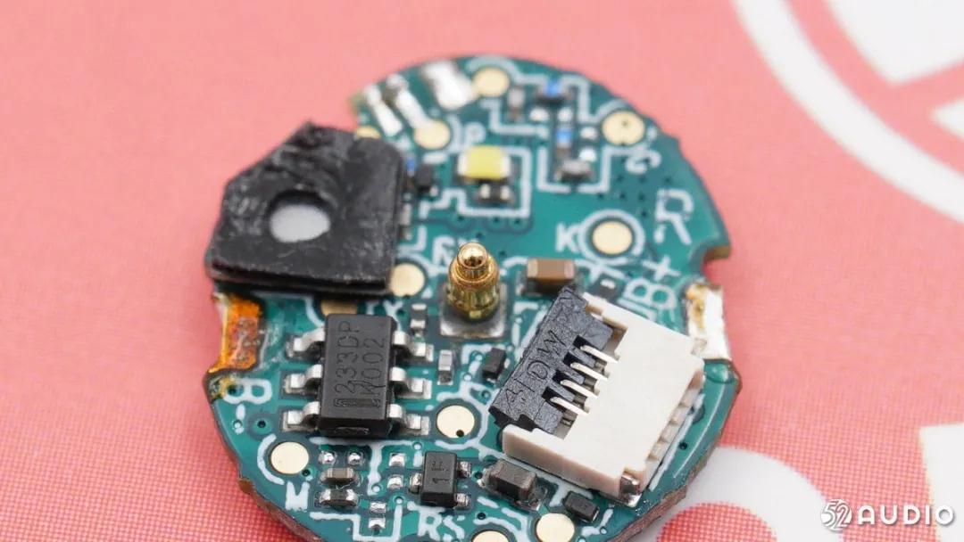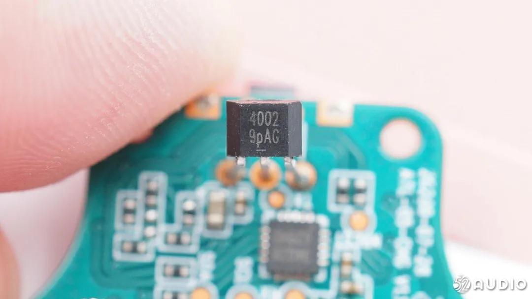丝印4002 9pAG的霍尔元件。充电盒盒盖开启、关闭时的磁场变化会被霍尔元件感知到,进而通知充电盒MCU和耳机与已连接设备配对或断开连接。
