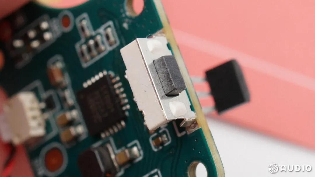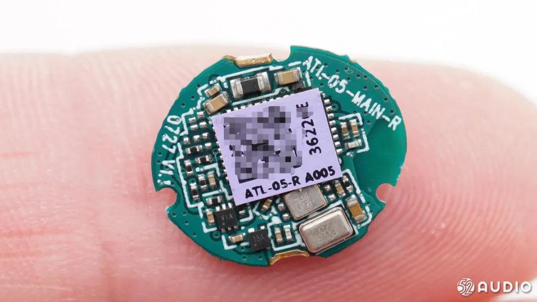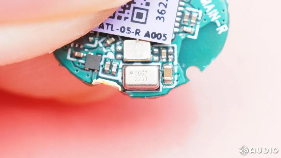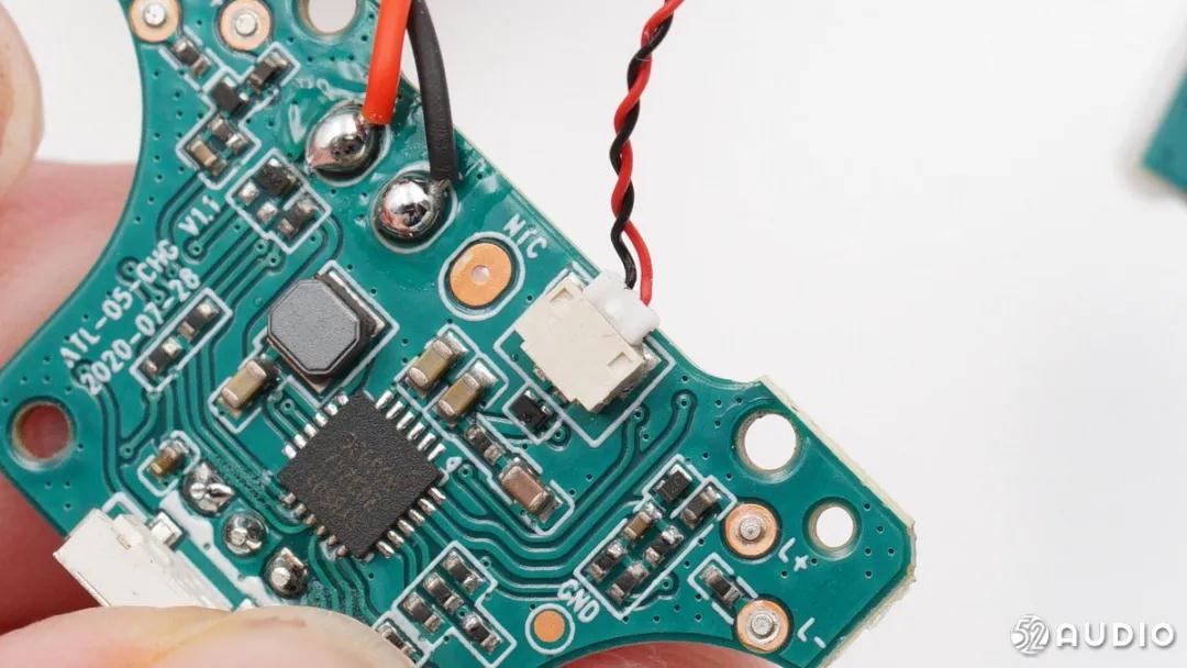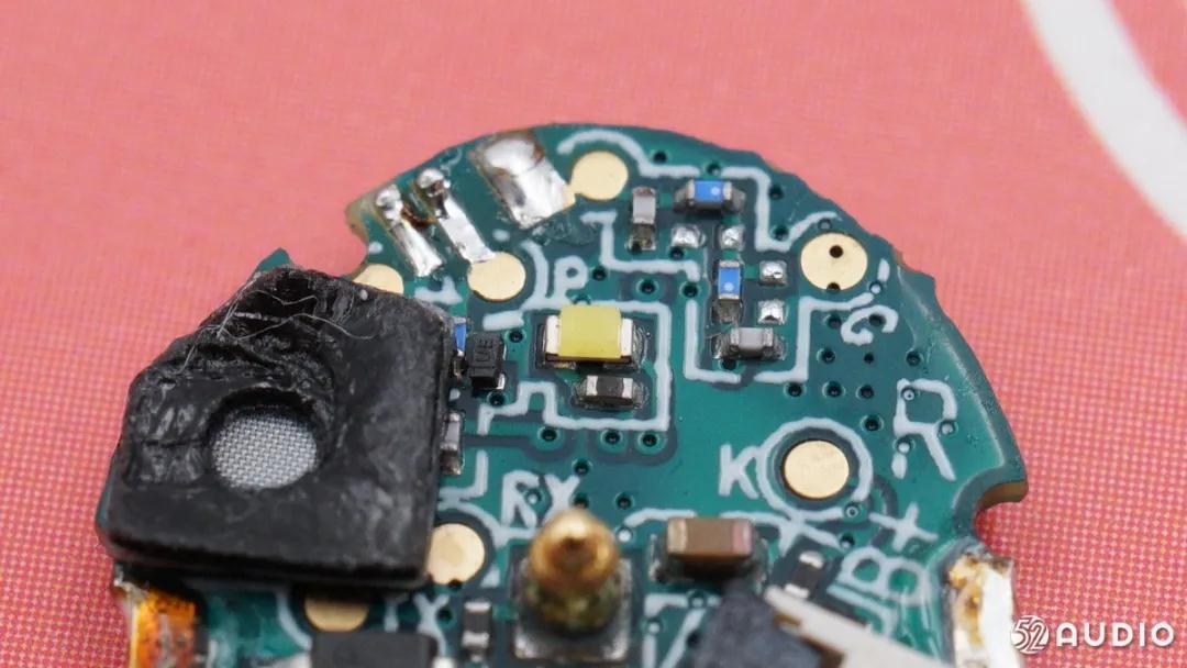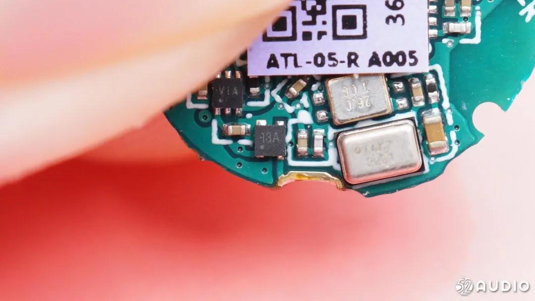 丝印4002 9pAG的霍尔元件。充电盒盒盖开启、关闭时的磁场变化会被霍尔元件感知到,进而通知充电盒MCU和耳机与已连接设备配对或断开连接。