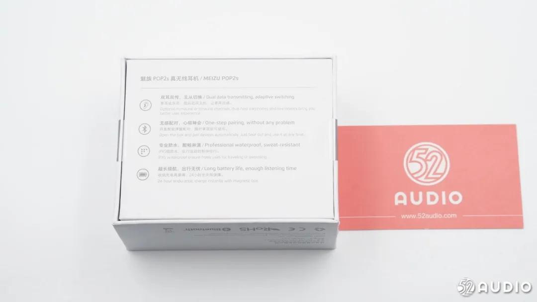 包装盒为天地盖设计,风格与前代一致,较为简洁,不过没有了魅族标志性的一抹蓝色装饰。左上角是魅族的品牌名,中间区域是耳机和充电盒的渲染图,底部是产品名“魅族 POP2s 真无线耳机”。