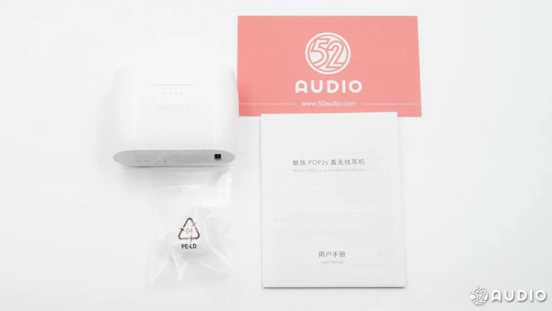 包装盒内物品,魅族 POP2s耳机和充电盒、额外附赠的硅胶耳塞和用户手册。