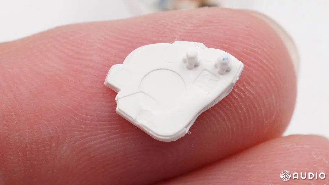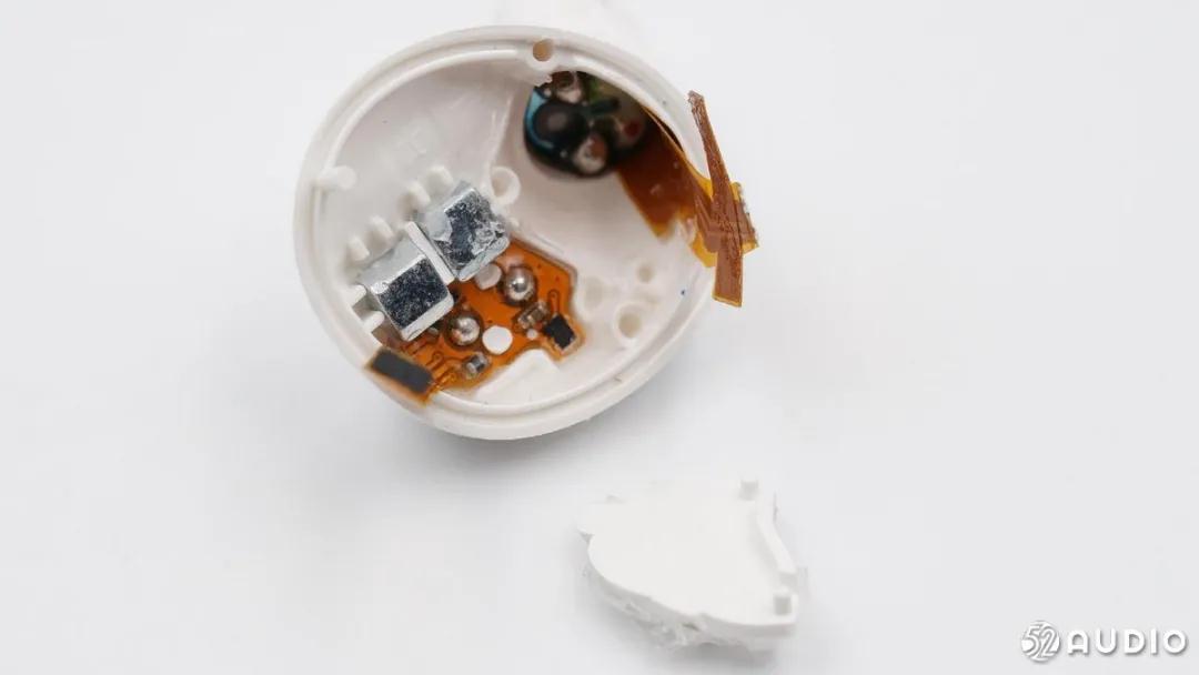 耳机部分,魅族 POP2s外型延续了经典设计,耳机壳体遵循黄金分割比例,螺旋状的设计更加贴合耳廓,不过这次的光环设计采用了白色,官方宣称与充电盒的白色指示灯更统一。耳机内部有一塑料支架固定电池和主板,音腔独立密封可以减少杂音,结构设计与前代相同。触控方案来自通泰233DP,扣式电池的供应商来自微电新能源,容量0.222Wh约60mAh。