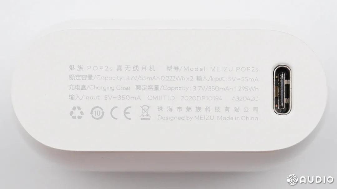 USB Type-C充电接口依然在充电盒底部一侧,旁边有部分产品信息。魅族POP 2s真无线耳机,耳机电池额定容量3.7V/55mAh,0.222Wh×2,输入5V?55mA。充电盒电池额定容量3.7V/350mAh,1.295Wh,输入5V?350mA。