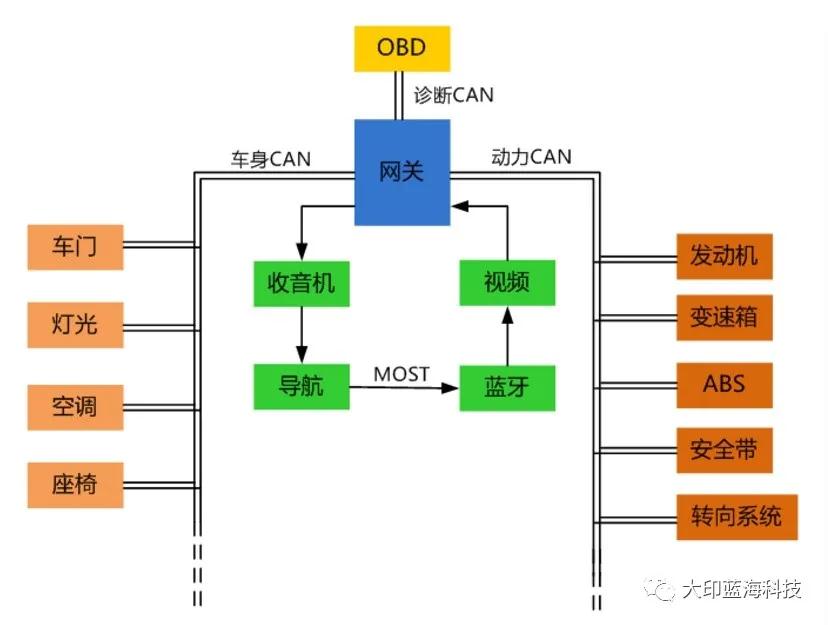 这里只是一个示意图,展示大概的逻辑连接方式,各家的总线架构都不太一样,但基本都包含了高速、低速CAN网络(低速有被淘汰的趋势),MOST主要用在对数据量要求比较大的娱乐系统中,并不是所有车辆的标配。