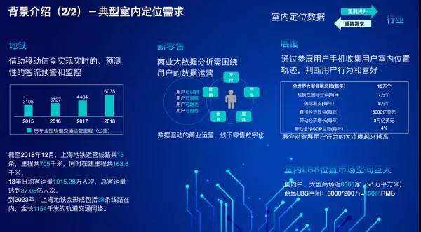 在地铁内,特别是在5G和申通合作的智慧地铁领域,中国电信脱敏的用户数据可以定位热力图,也就是人流的分流。在新零售方面,华润、万达也开始了室内定位方面的探索。新零售最初是希望进行传统零售的转型,现在美国沃尔玛正计划通过用户选择商品的路径分析来改变运营模式,这也是新零售的需求。在展馆方面,未来中国的市场很大,比如在上海国展中心,展览和展会活动特别多,现在多用是路标指示,其实有时候即便有路标也很难找到想去的展馆,所以人们对大型展馆的定位也是有需求的。