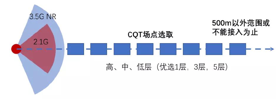 When conducting deep coverage CQT testing, select no fewer than 7 buildings in the near-to-far direction from the main lobe normal direction of the 3.5G and 2.1G cells as CQT test buildings, until the buildings are 500 meters away from the base station or cannot be accessed, as shown in Figure 2.