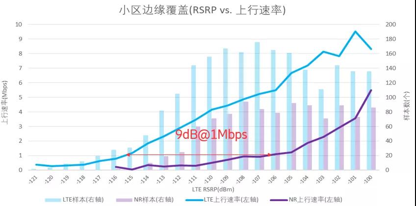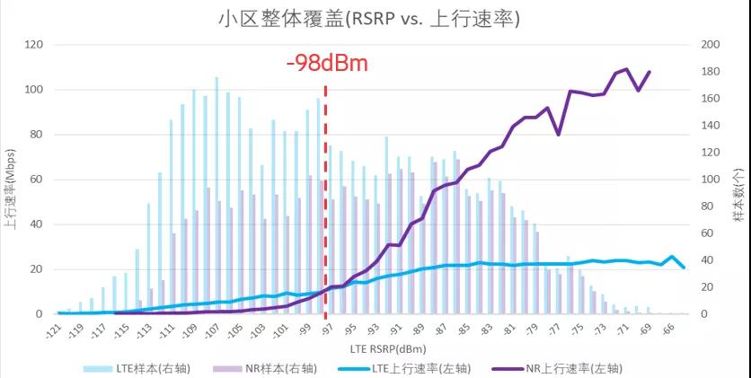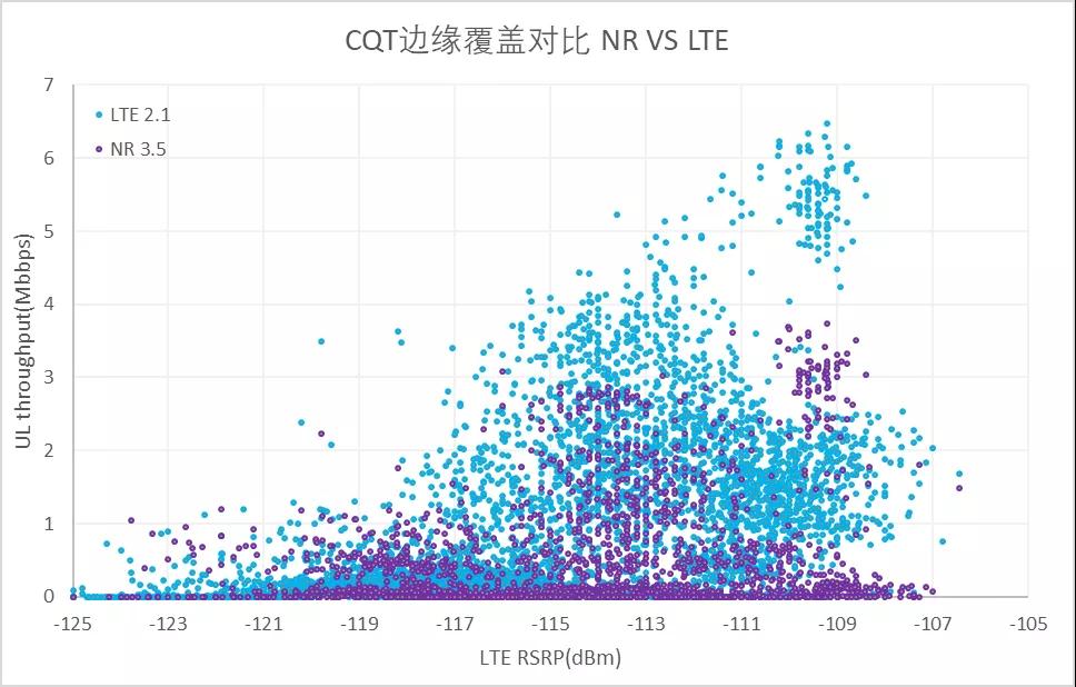 In the analysis of the DT test data, LTE 2.1G mobile phones and NR 3.5G mobile phones are positioned at the same location and simultaneously conduct blanket coverage tests within the cell. For the purpose of comparative analysis, the LTE and NR rates at the same location are normalized according to LTE RSRP.