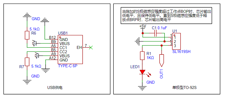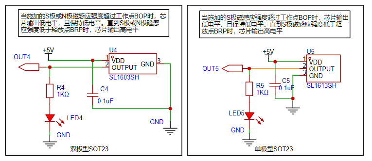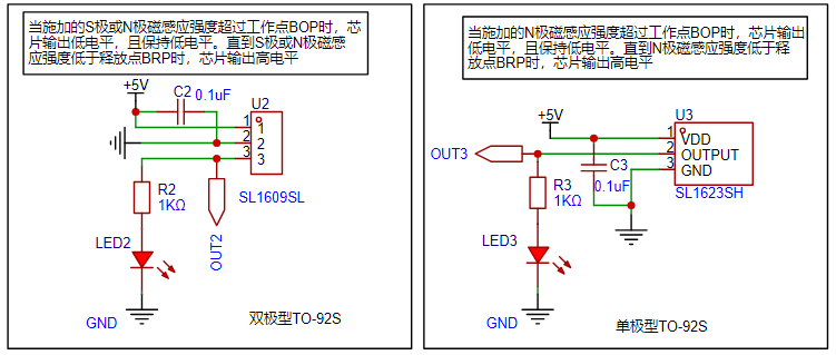Slkor Hall sensors SL1609, SL1603X, and SL1613X are all low-power Hall switches. Their maximum output current is 5mA, which can directly drive small signal loads like switches. In this circuit, it is directly connected to a 1K resistor and an LED. The LED turns off when a magnetic field is detected.