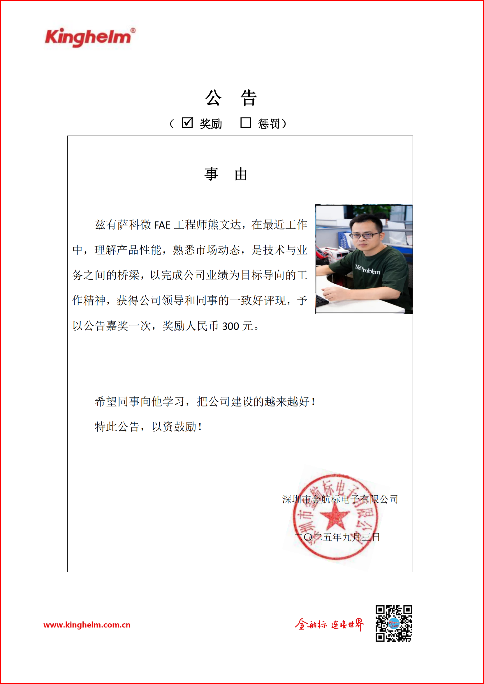 From September 1, 2025, to September 5, 2025, through colleague evaluations, the "Star of the Week" is FAE Engineer Xiong Wenda. In his recent work, he has demonstrated a deep understanding of product performance and market trends, acting as a bridge between technology and business. His goal-oriented work ethic, focused on achieving company objectives, has earned unanimous praise from company leadership and colleagues.