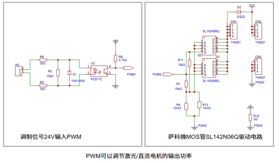 The input modulation signal provides a PWM waveform to drive the Slkor PC817 optocoupler U2. Here, when the 24V pulse waveform is high, the optocoupler current is around 6mA (5V control can also be used by changing the current-limiting resistors R6 and R8). Optocoupler U2 is mainly for signal isolation. Its power is supplied by the DC-DC power management IC Slkor (www.slkoric.com) LM2596S-5.0 providing 5V. The external modulation signal can be provided by a PLC. D1 is a Slkor switching diode, here used for freewheeling; it protects optocoupler U2 when the modulation signal is reverse-connected. U1 is the gate driver chip Slkor SL27517A, a single-channel 4A high-speed low-side gate driver that can efficiently and safely drive MOSFETs and IGBTs. Features like low propagation delay, compact SOT-23 package, and very low quiescent current allow the MOSFET switching frequency to reach hundreds of kHz. This chip is very suitable for synchronous rectification driving in servers and communication power supplies, as well as industrial applications.
