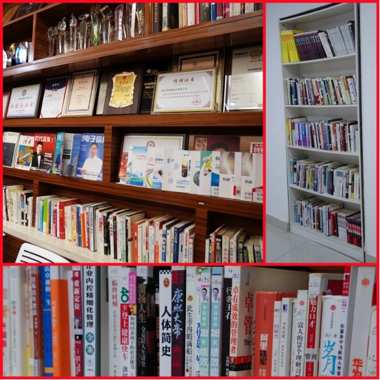 A Wall of Books, Publications, and Awards Behind Mr. Chen