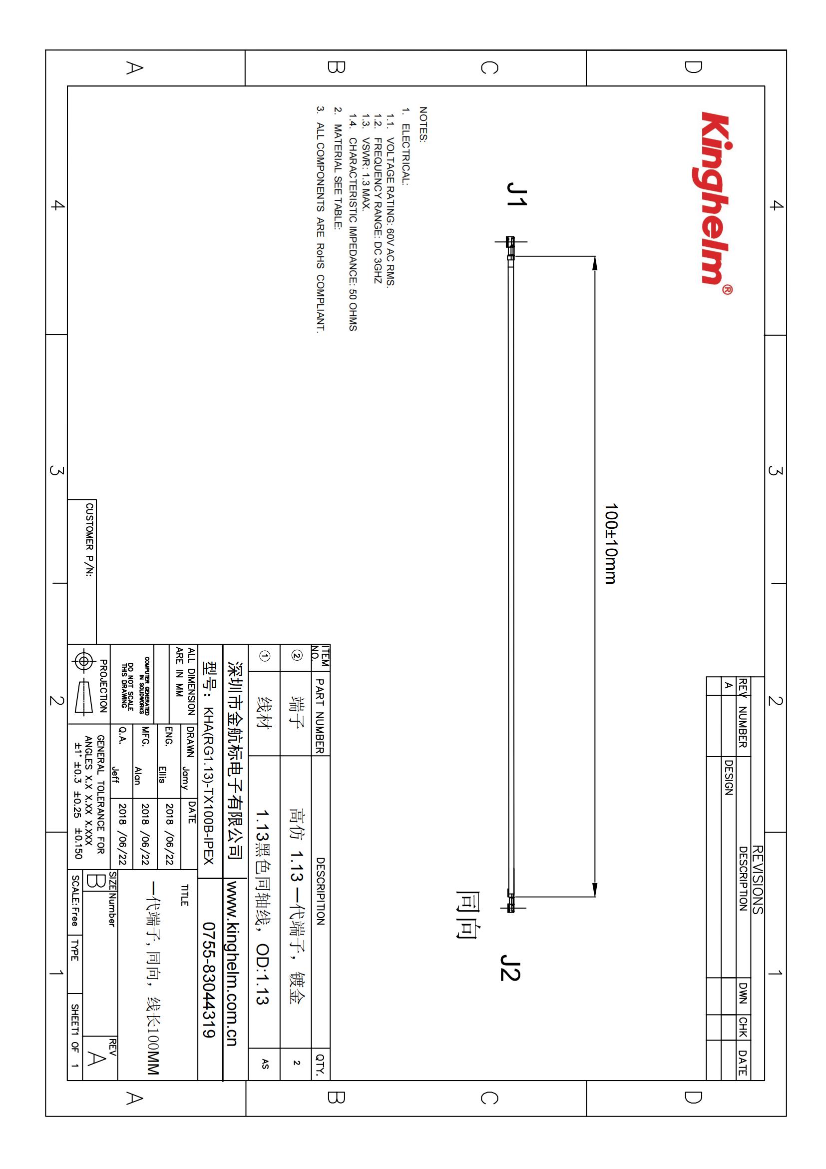 Alternative Replacement for TE Connectivity 2015357-3 | Kinghelm RF Cable Assembly KHA(RG1.13)-TX100B-IPEX Product:KHA(RG1.13)-TX100B-IPEX Category:RF Cable Assembly Classification:RG1.13 Jumper Wire Type:100mm