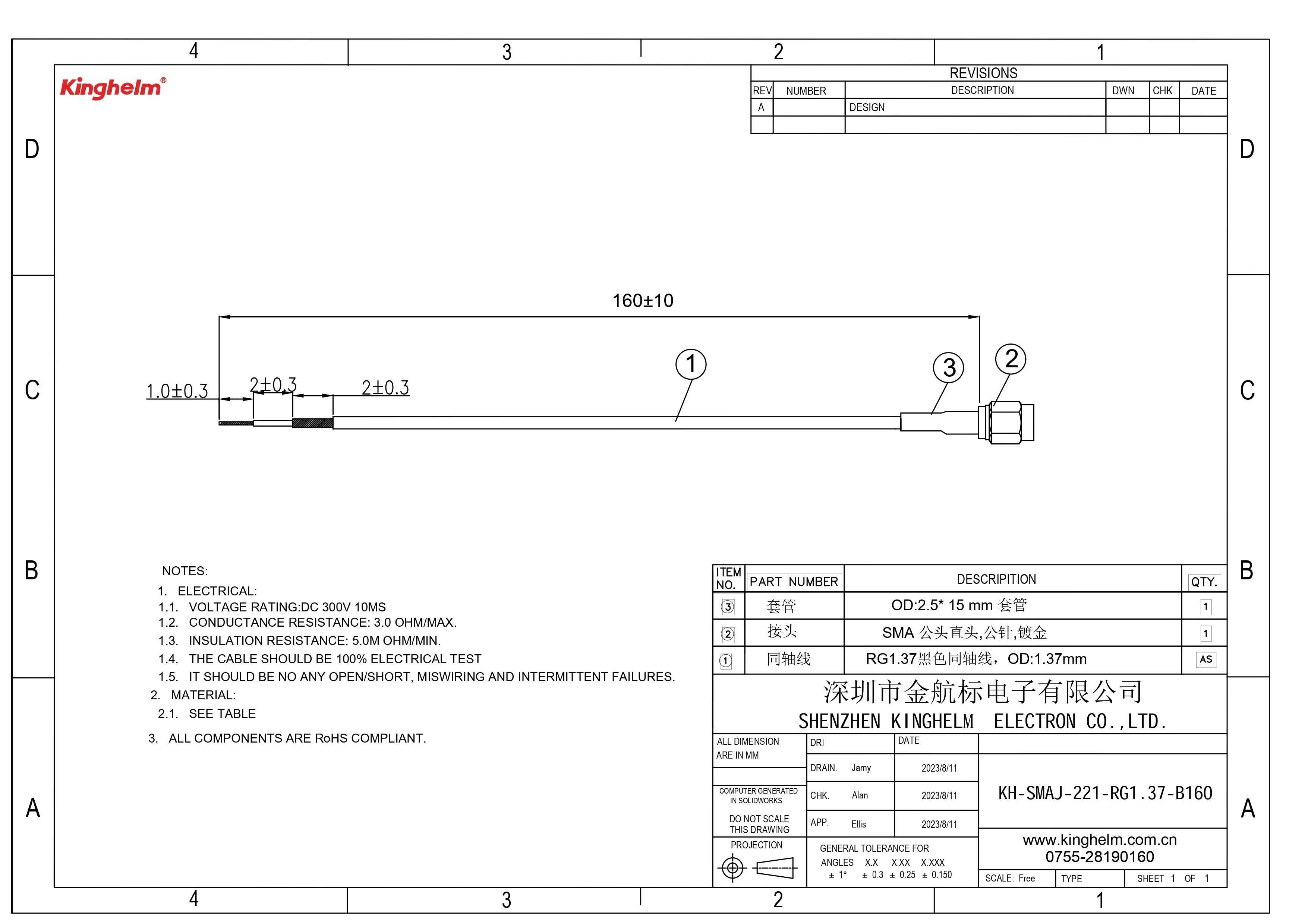 SMA Male Plug To SMA Male Plug, RG1.37,160mm,KH-SMAJ-221-RG1.37-B160 Product:KH-SMAJ-221-RG1.37-B160 Category:RF Cable Assembly Classification:RG1.37 Jumper Wire Type:160mm