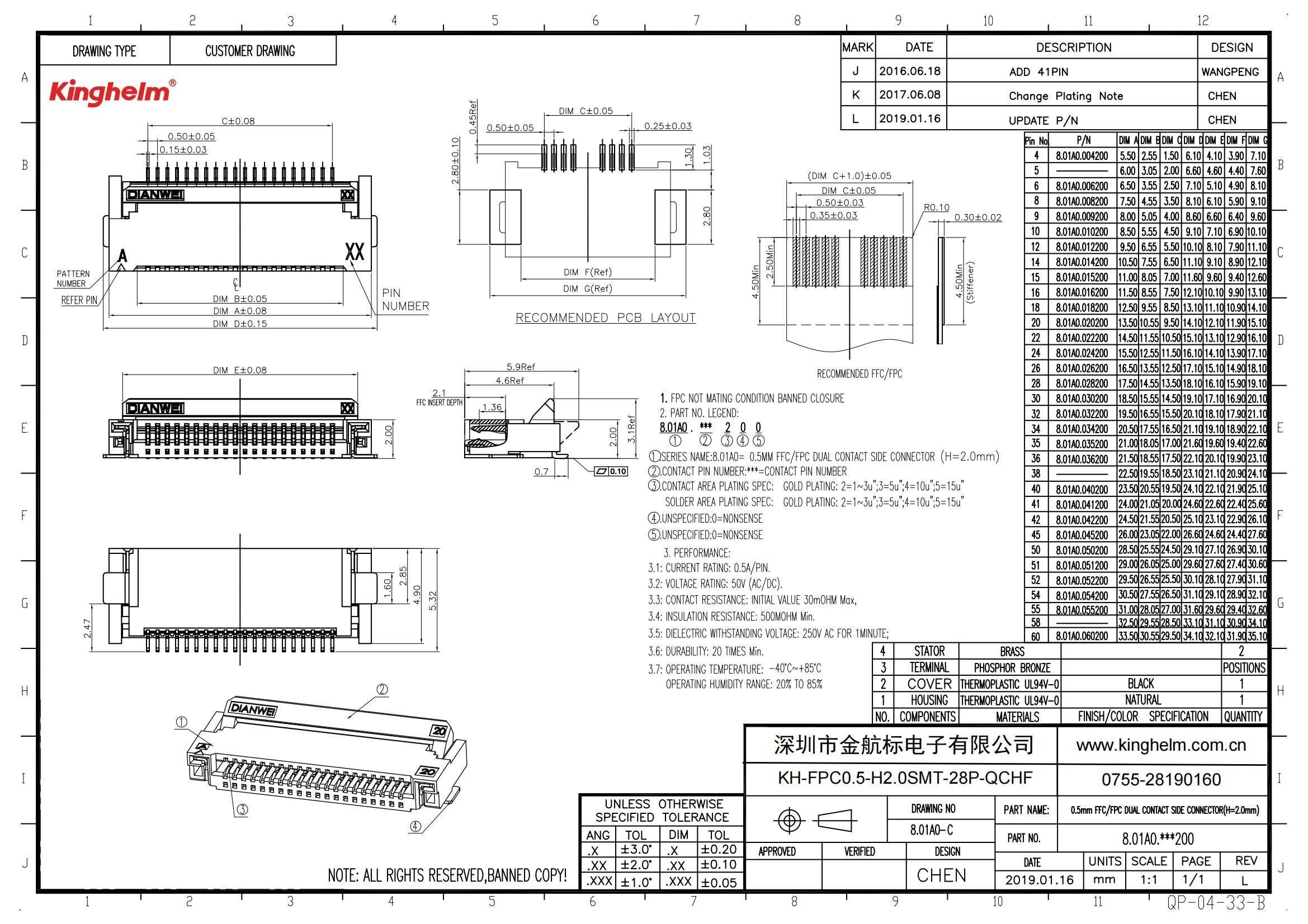0.5 mm FPC Connectors | FFC & FPC Connectors Manufacturer Product:KH-FPC0.5-H2.0SMT-28P-QCHF Category:Connector Classification:FPC Connector Type:Pitch: 0.5mm